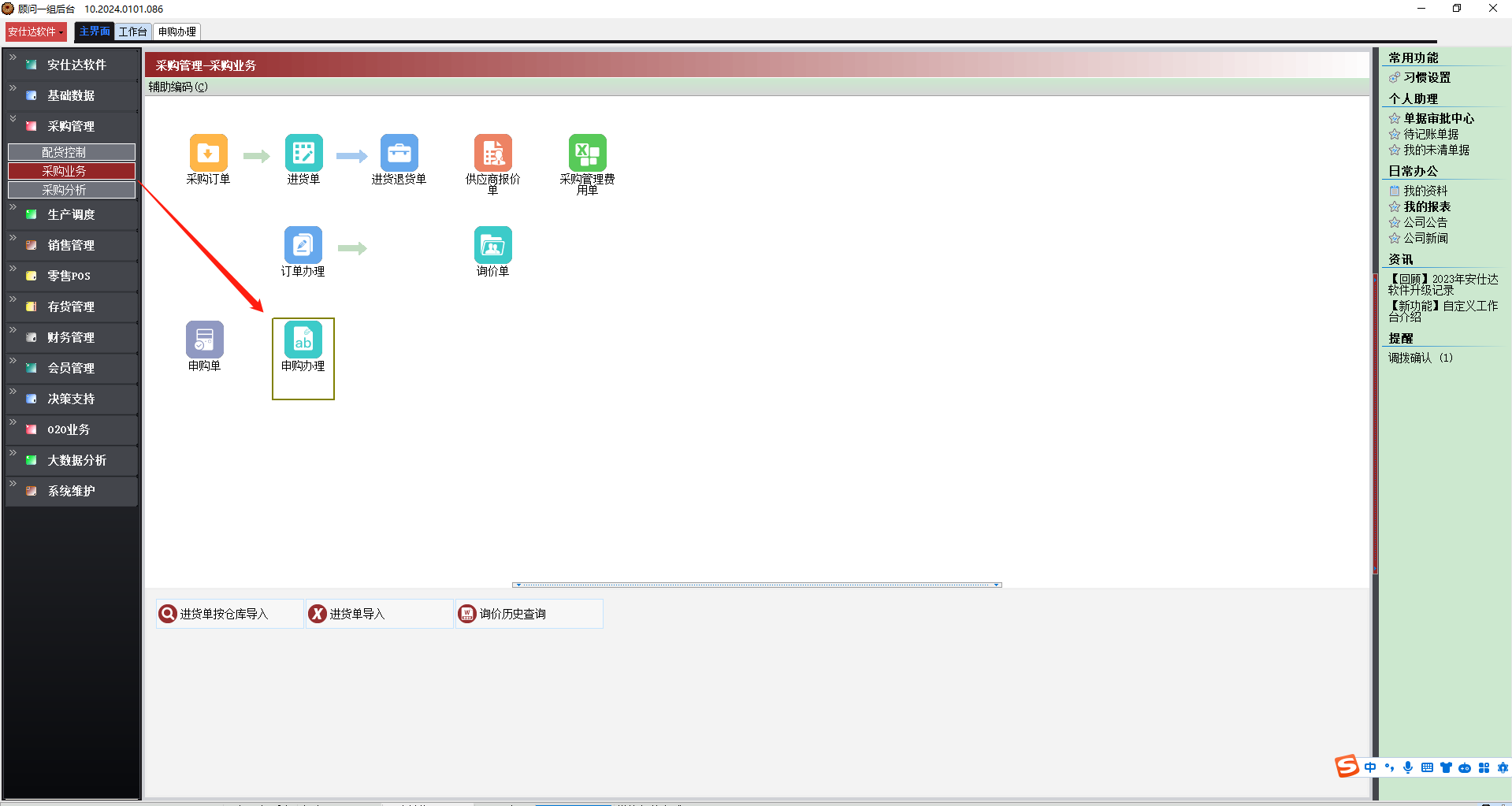 采购管理→采购业务→申购办理