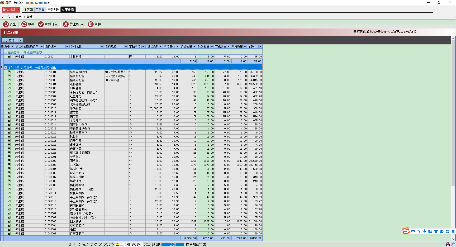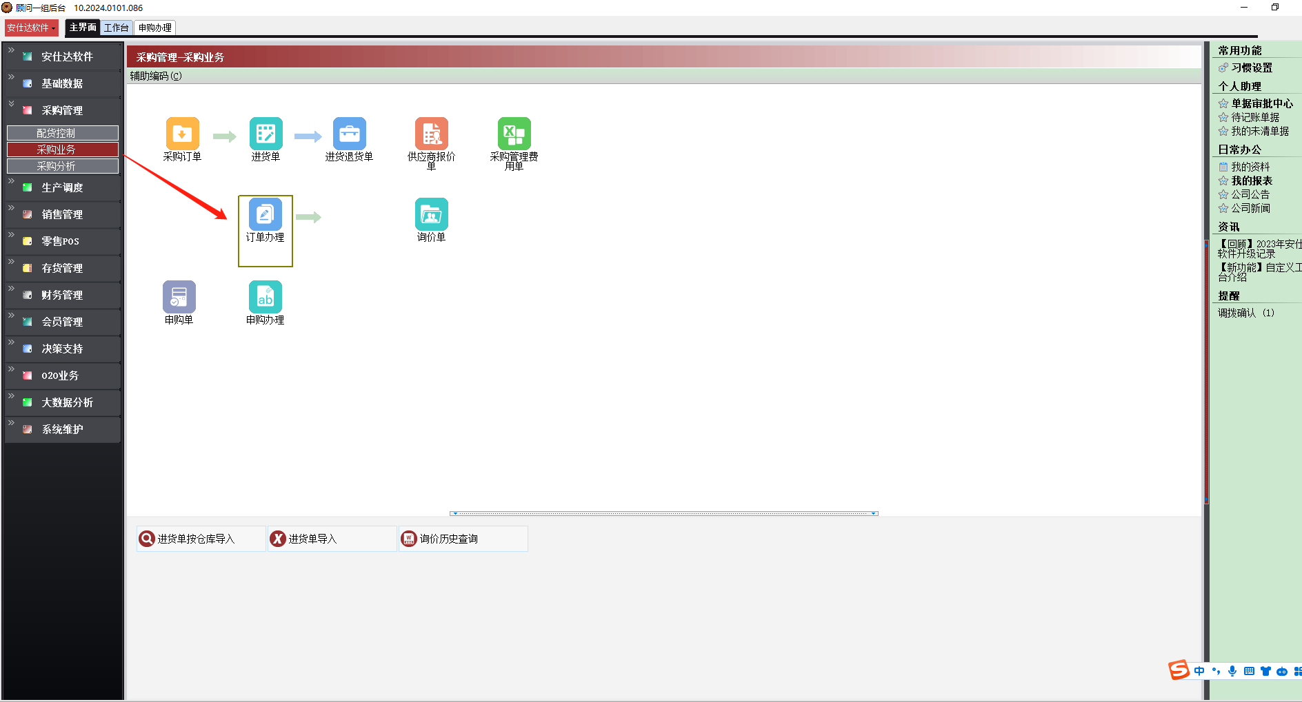 订单办理就是处理门店的订单,门店下的订单在订单汇总窗口审批之后就可以在订单办理那里查询到,选中需要生成订单的物料后点击生成订单,然后在采购订单查询的草稿状态中能找到该物料生成的采购订单,将采购订单找出来之后,直接生效即可