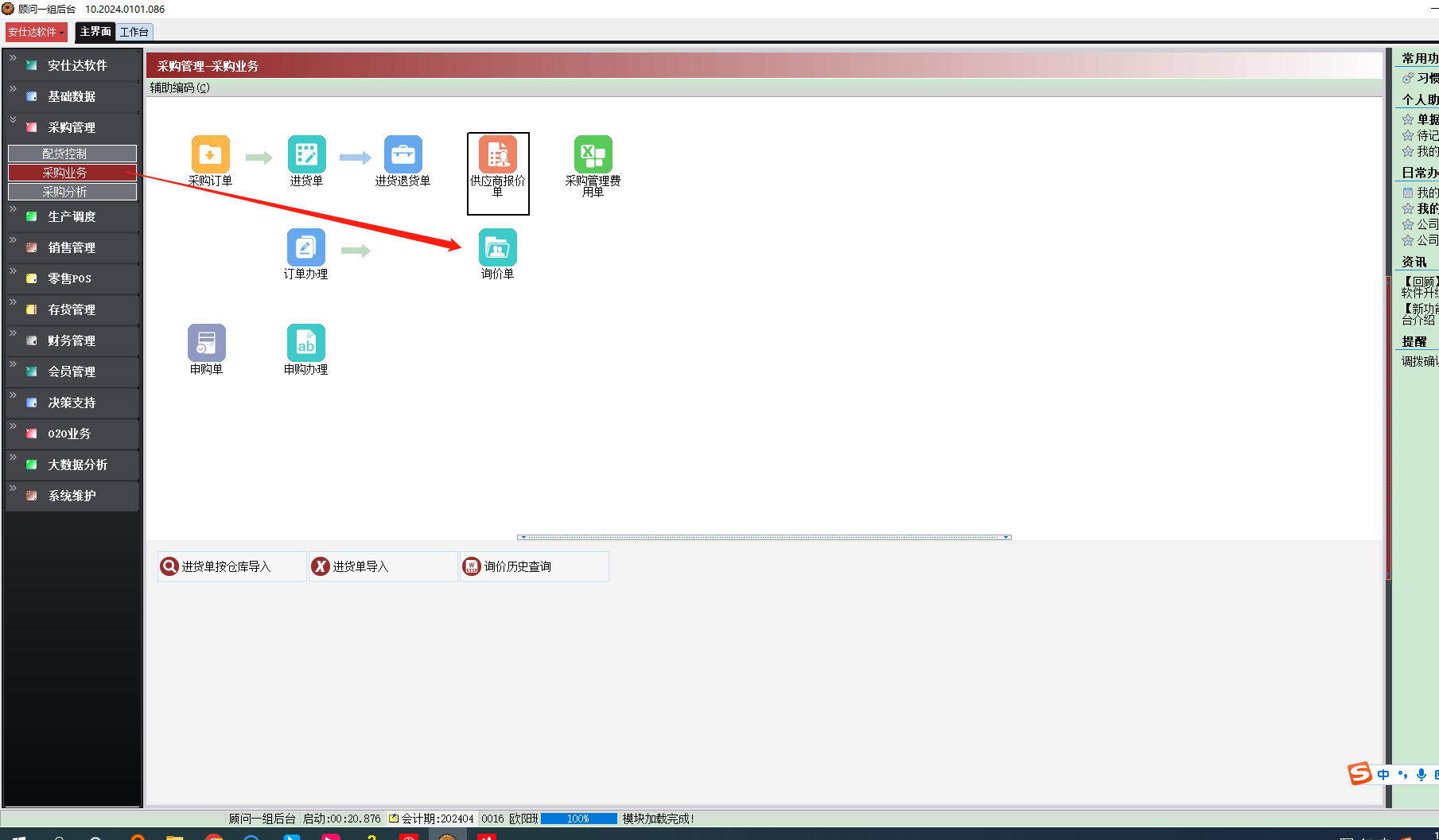 进入系统→采购管理→采购业务→询价单