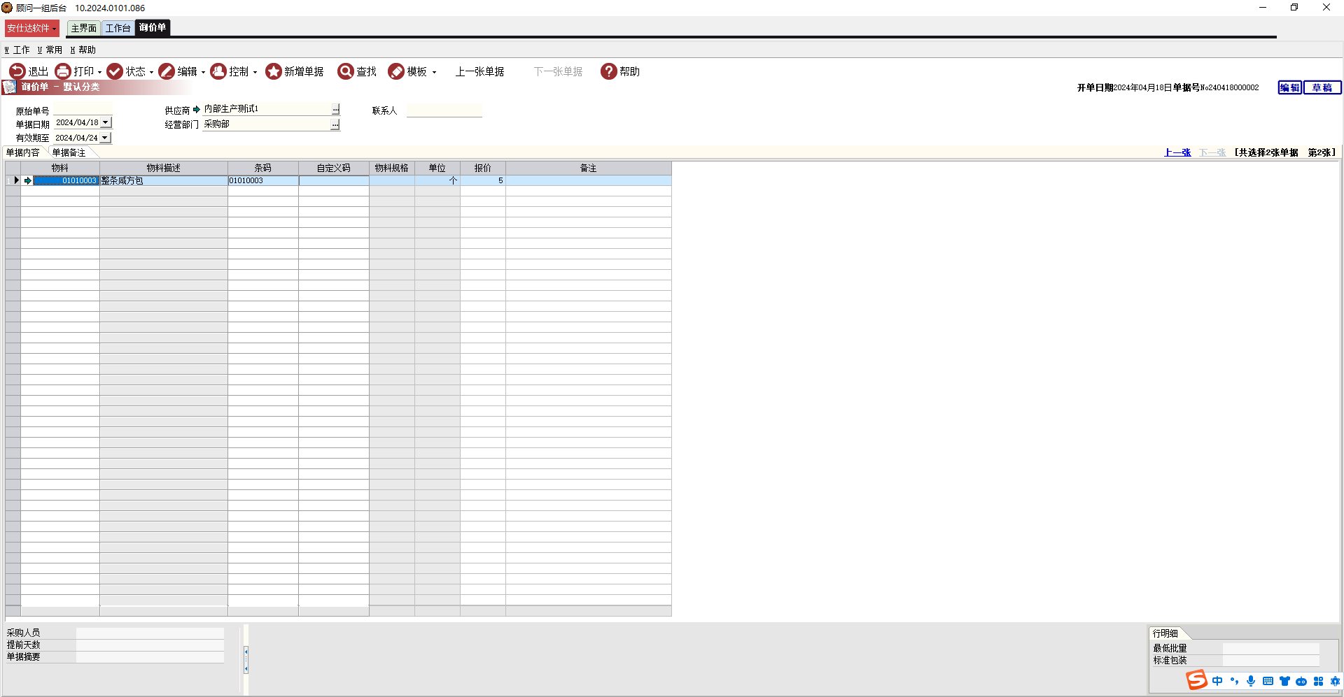 步骤2:在单据体中输入您需要询价的物料,即在物料那里输入商品的编号,回车,商品的信息就会出来,同时系统会自动显示“报价”,这里报价默认取自【基础数据】→【物料编码】→【物料编码】中的标准进价,用户可以根据具体情况自行修改报价。还可以在右下角的“行明细”输入相应物料的最低批量和标准包装。