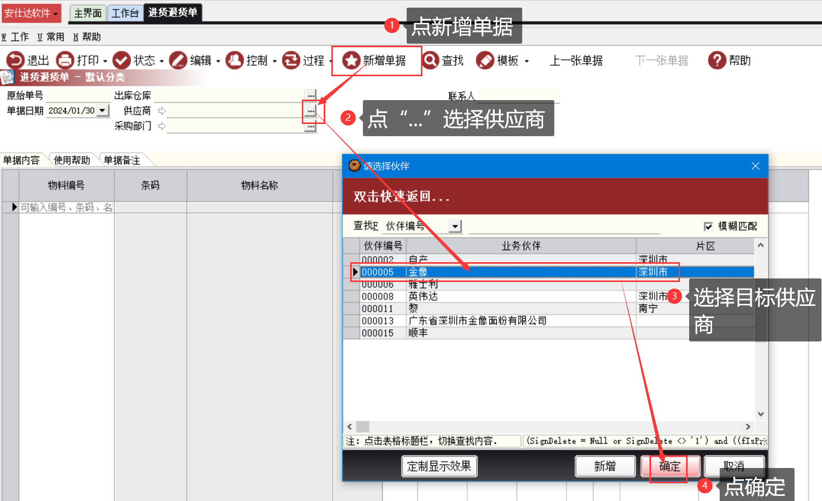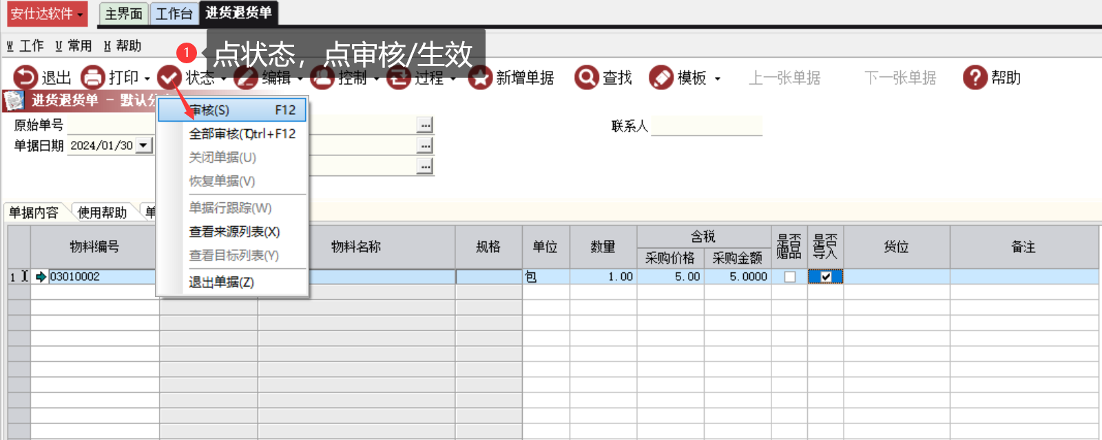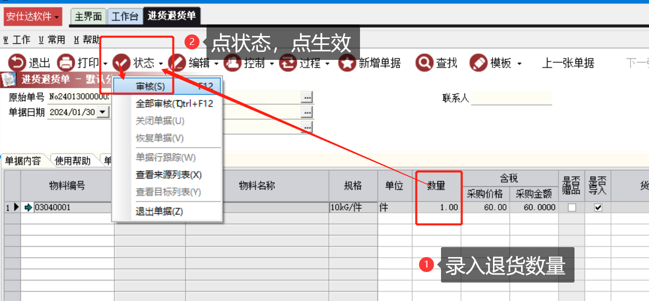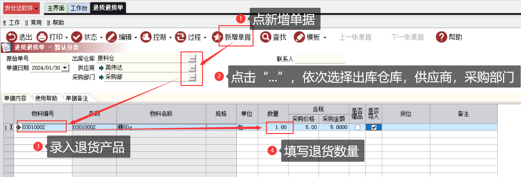 ①点击新增单据-->选择出库仓库,供应商,采购部门-->录入退货产品-->填写退货数量-->点状态-->点审核/生效;