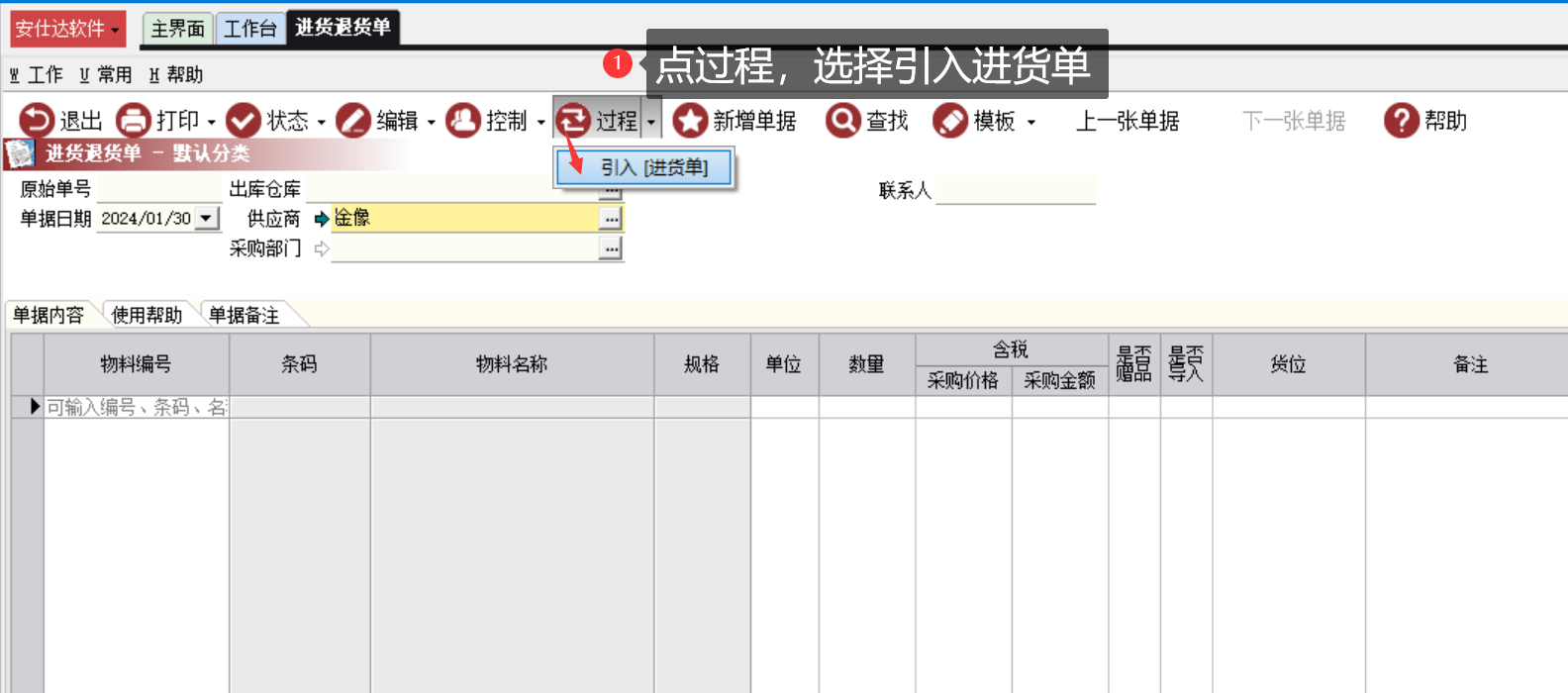 二是根据进货单引入采购进货单生成采购退货单。先选择相应的出库仓库和供应商,然后点“过程”引入“采购进货单”。如下图:
