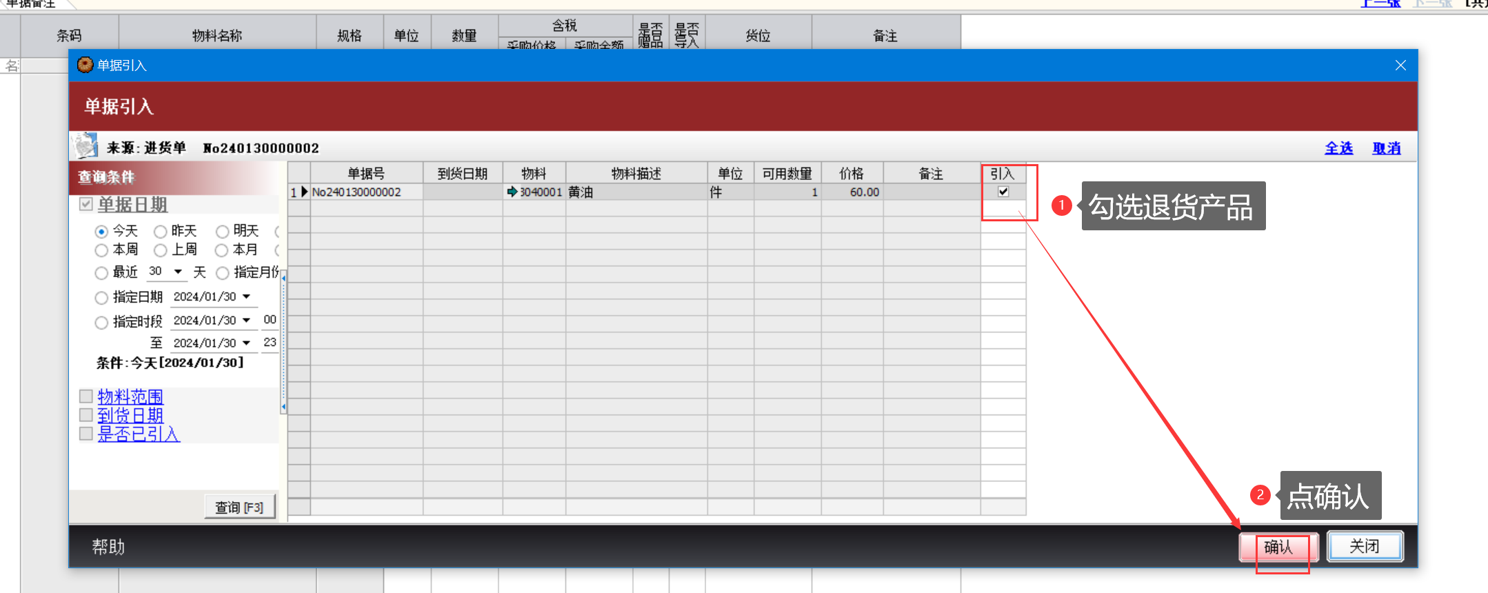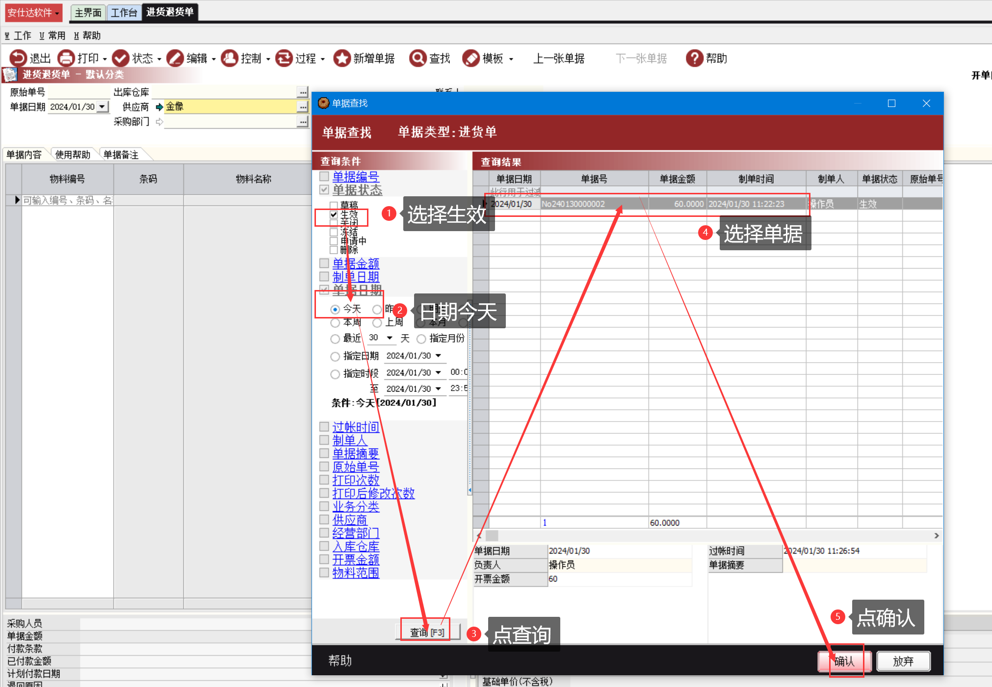 ③选择单据状态生效-->单据日期-->点击查询-->选择单据-->点确认