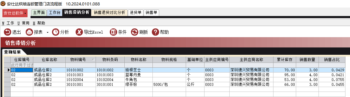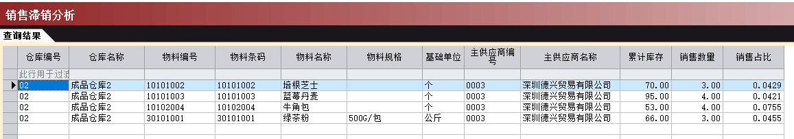 销售滞销分析可以查询某供应商采购的某种物料长时间销量很低或是没有卖出去的一个总体统计分析报表
