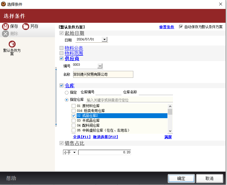 1.进入查询界面后,设置查询条件比如:可以根据日期、物料范围、供应商、销售占比等