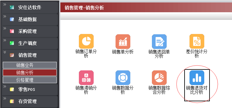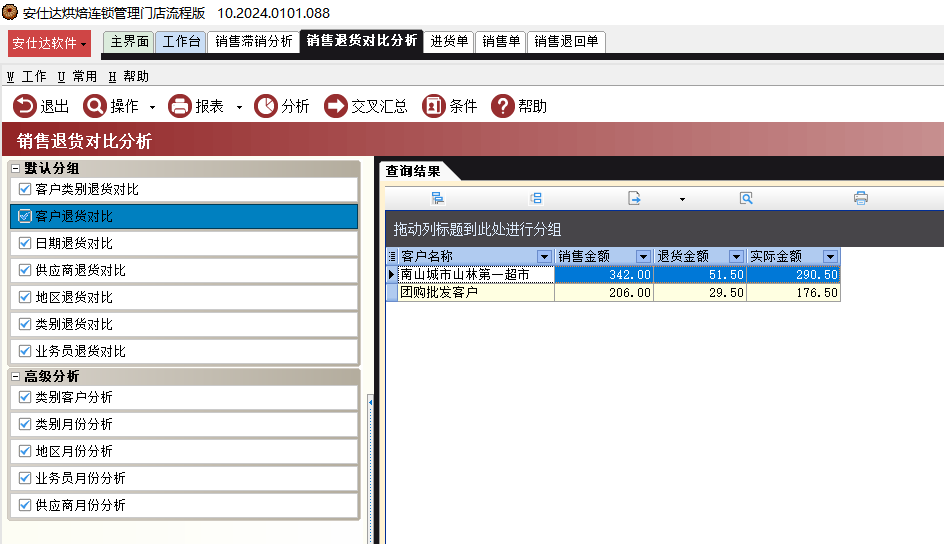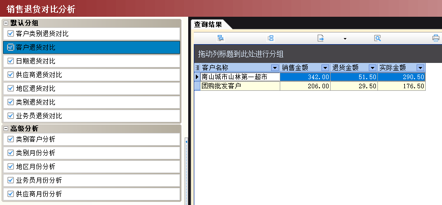 销售退货对比分析报表能够以单据日期、客户类别、会计期等作为查询条件来查询某个客户的销售金额与退货金额等。