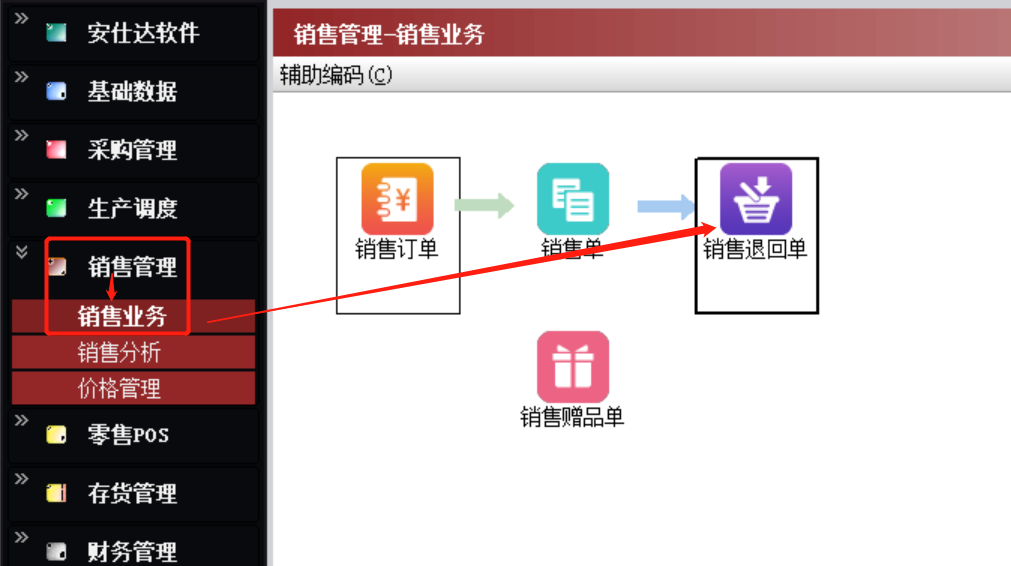 路径:在功能菜单栏点击【销售管理】→【销售业务】→【销售退回单】