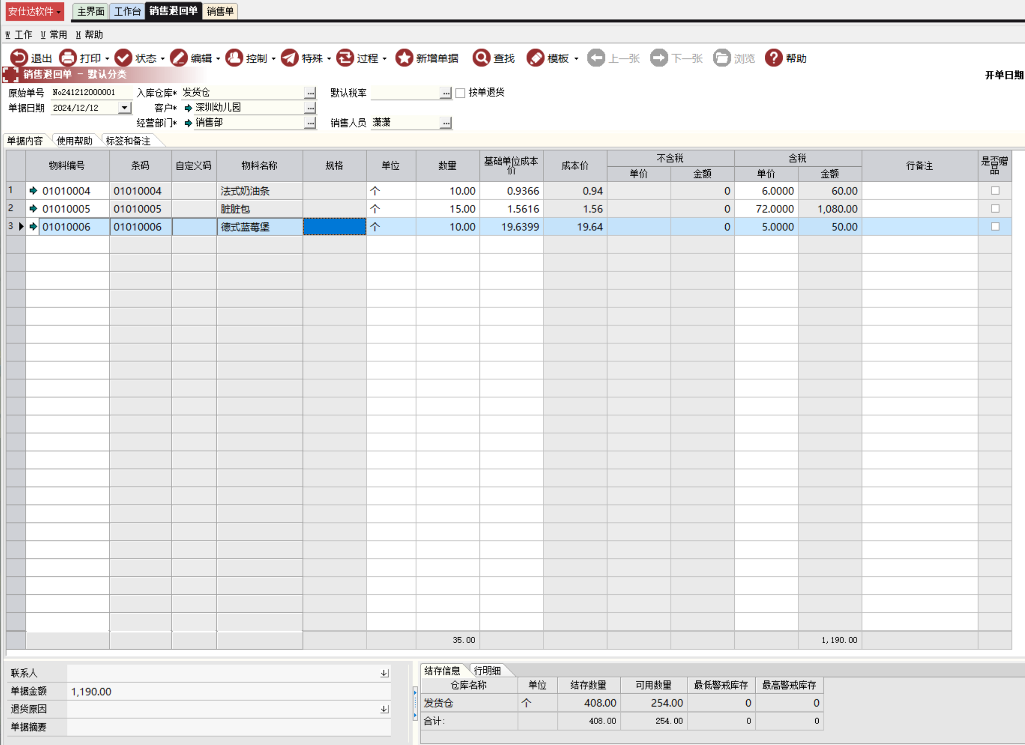 举例:引用“深圳幼儿园”的销售单进行退货。