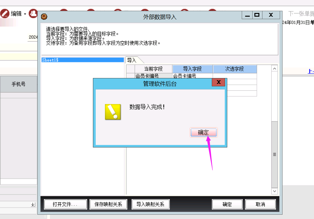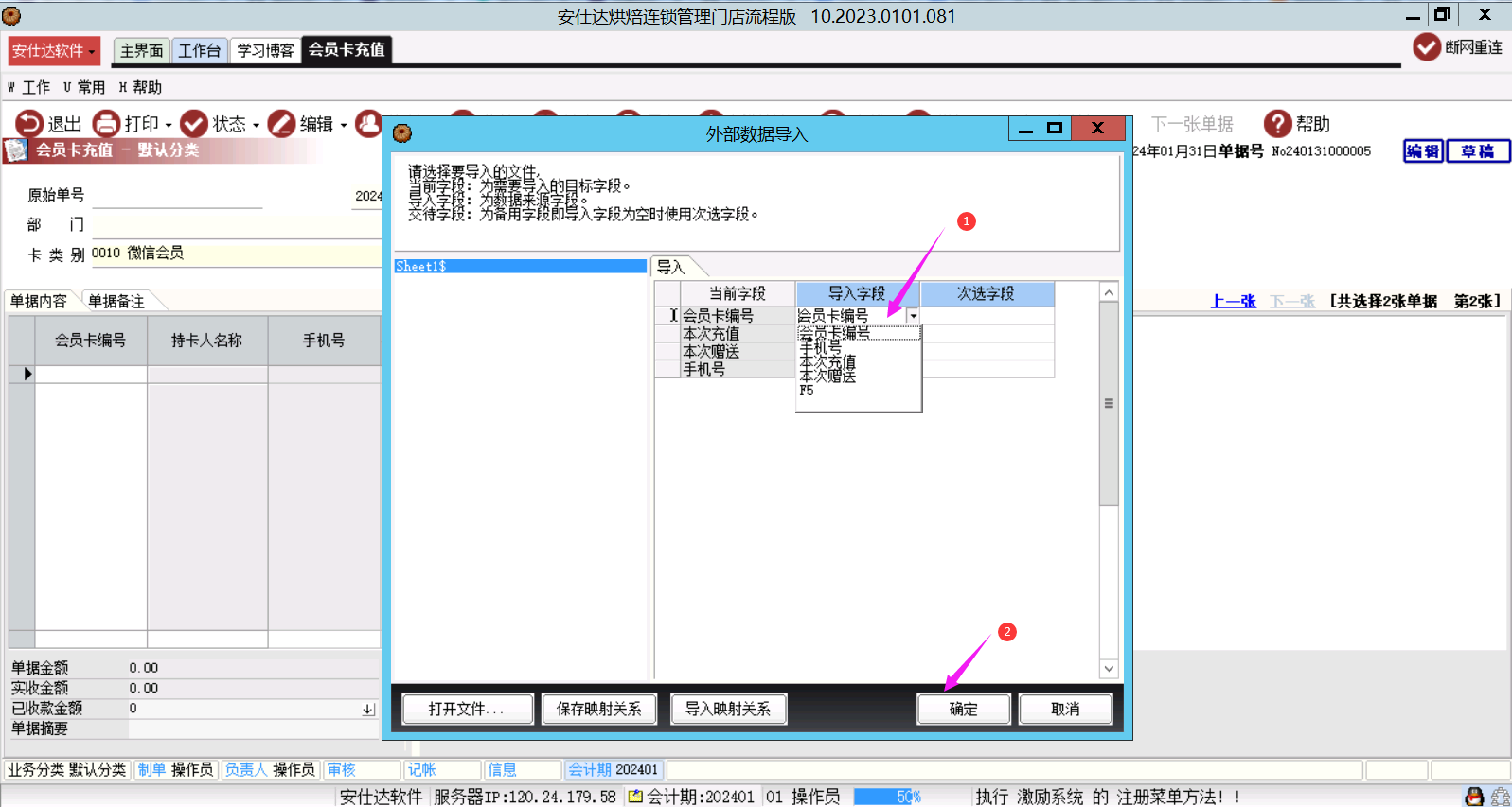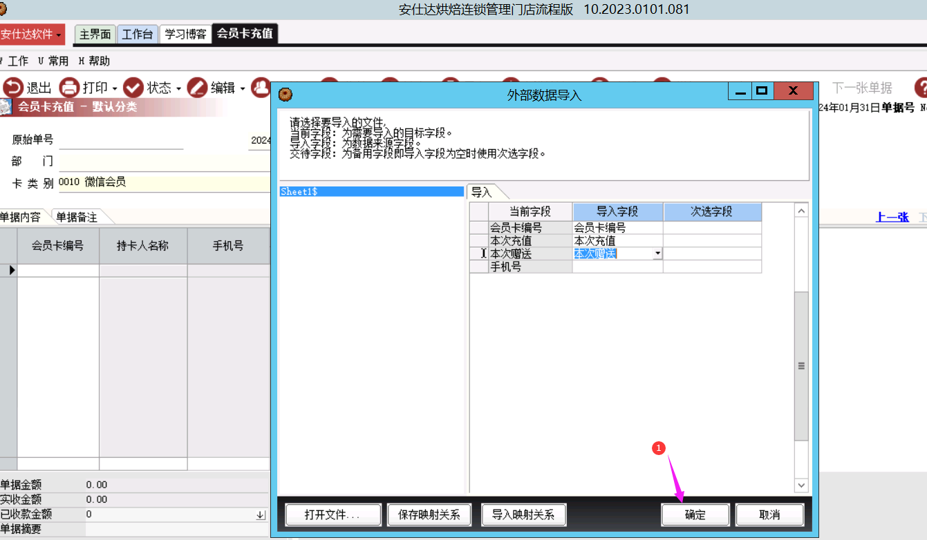③在导入字段选择表格内对应的标题,选择好会员卡编号、本次充值、本次赠送后,点击确定
