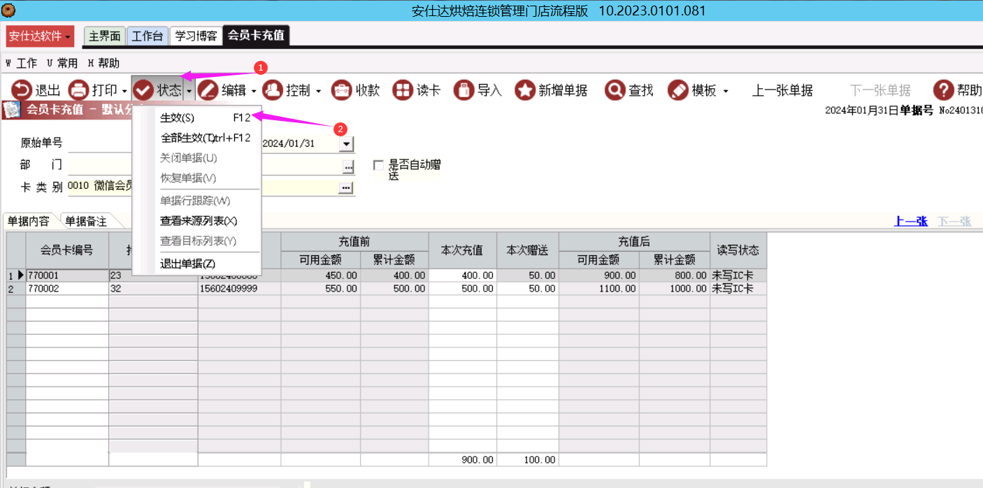 ⑤核对导入的会员卡号、充值金额以及赠送金额,然后点击状态,生效即可