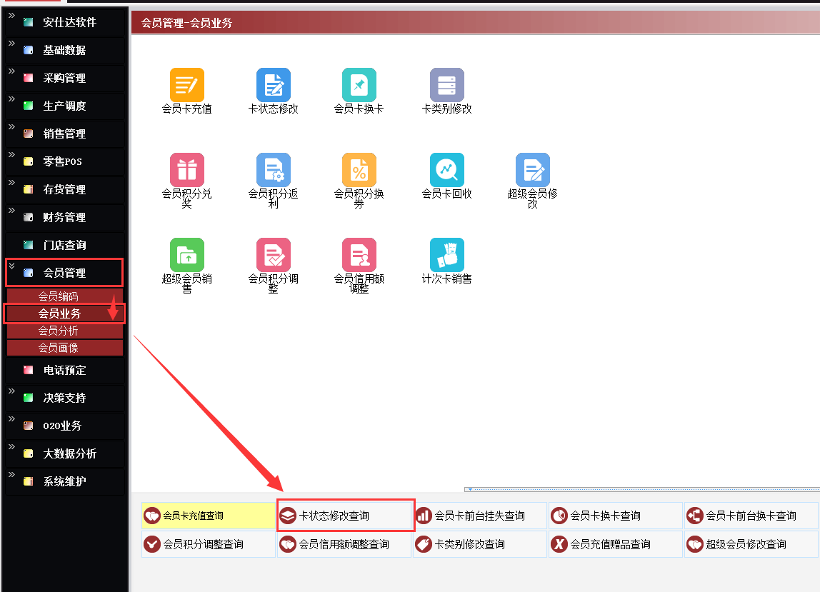 路径:【会员管理】→【会员业务】→【卡状态修改查询】