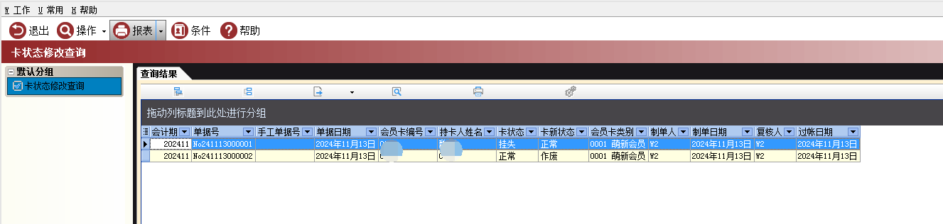 用于查看卡状态修改的信息,查询包括什么卡号原来状态是什么改为什么状态、单据时间等信息。