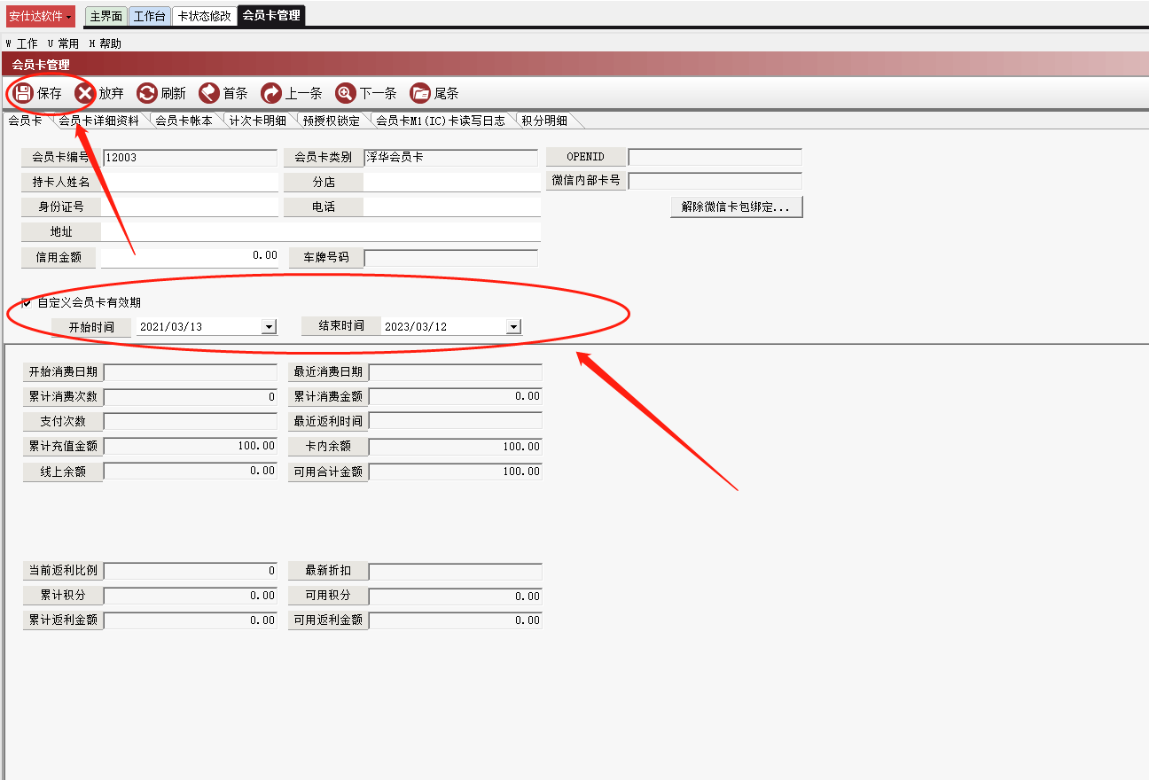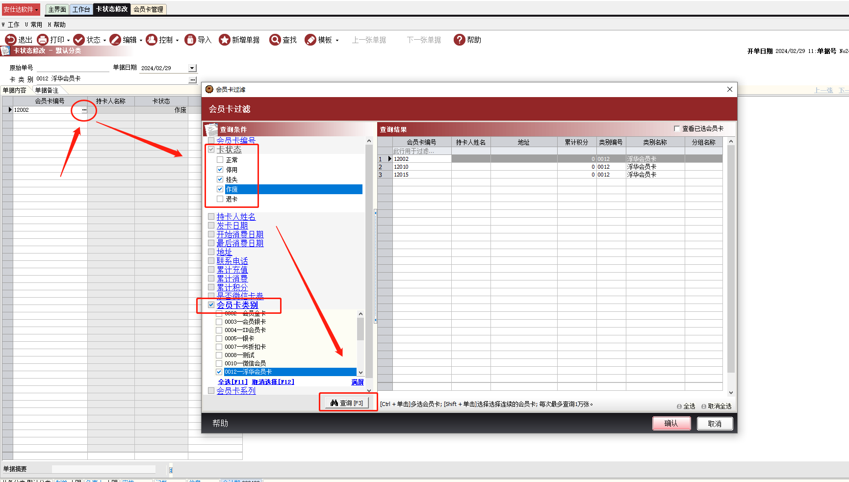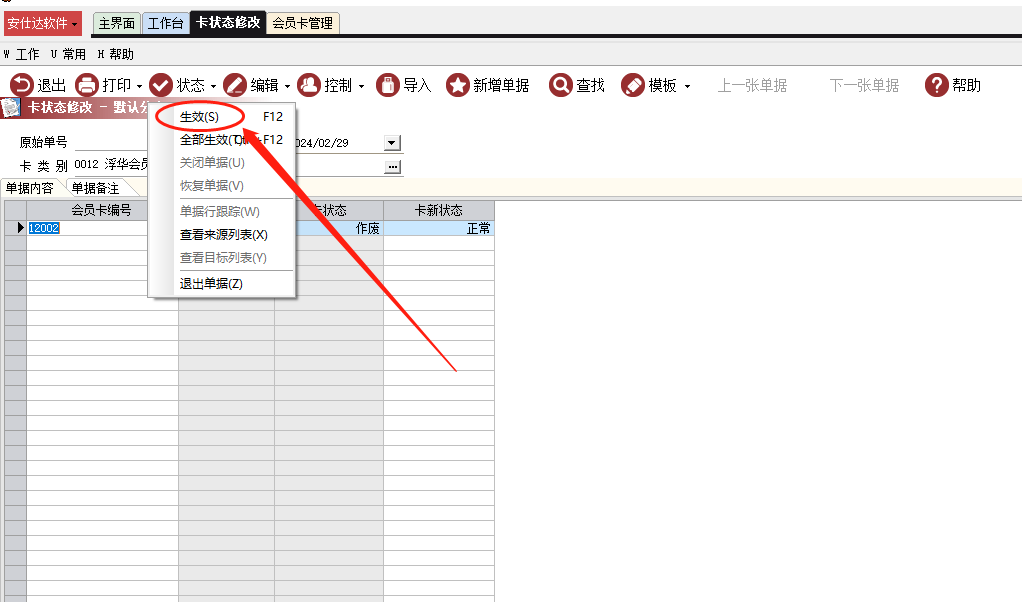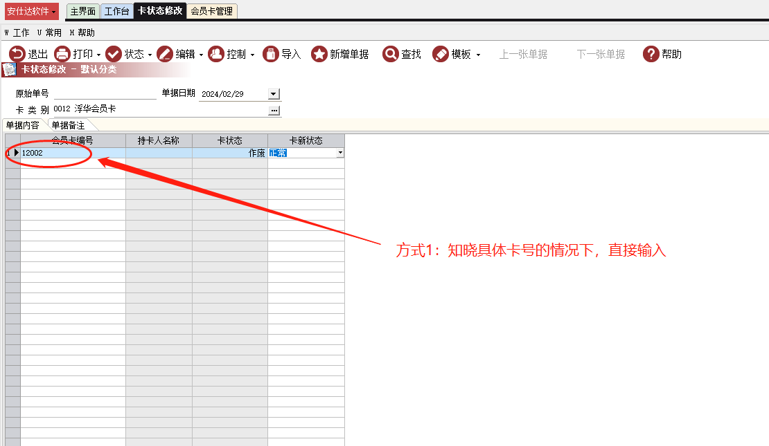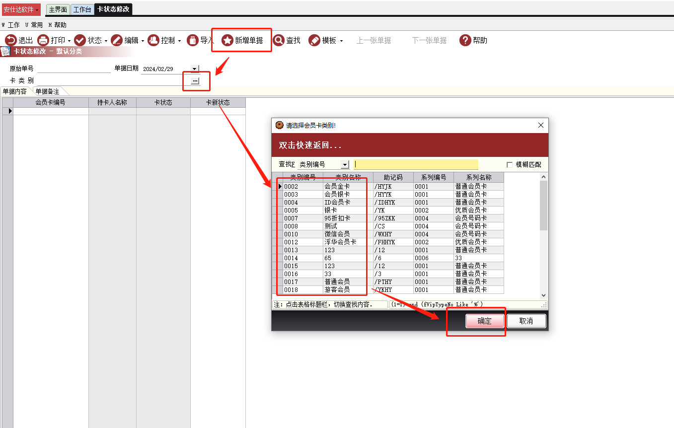 新增单据,选择卡类别、输入卡号并选择会员卡新状态