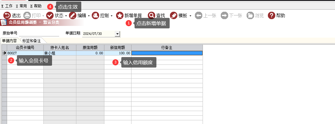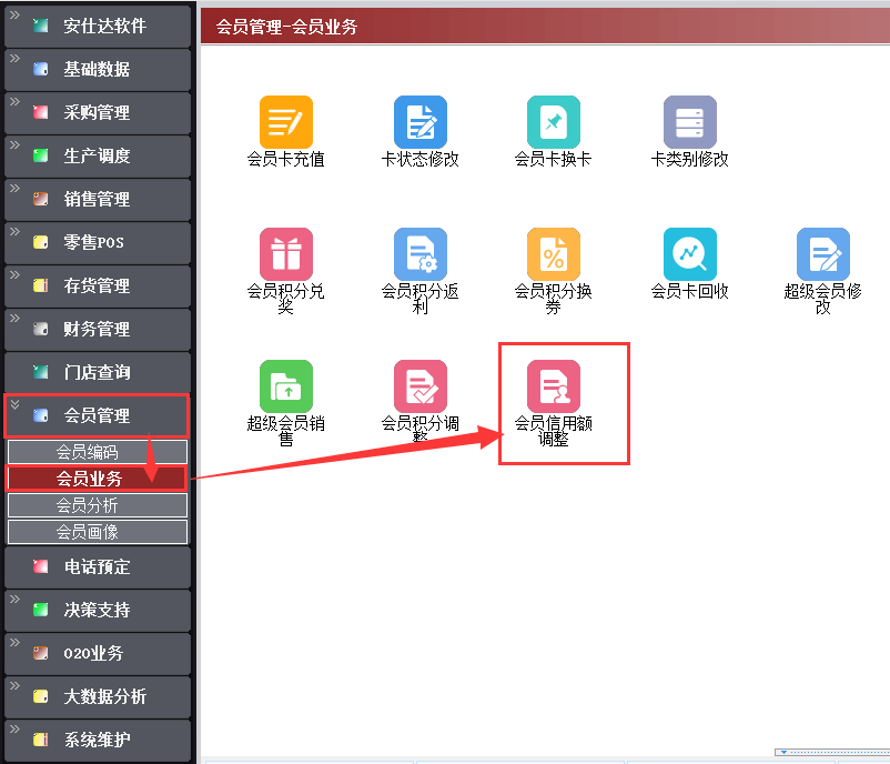 路径:【会员管理】→【会员业务】→【会员信用额调整】