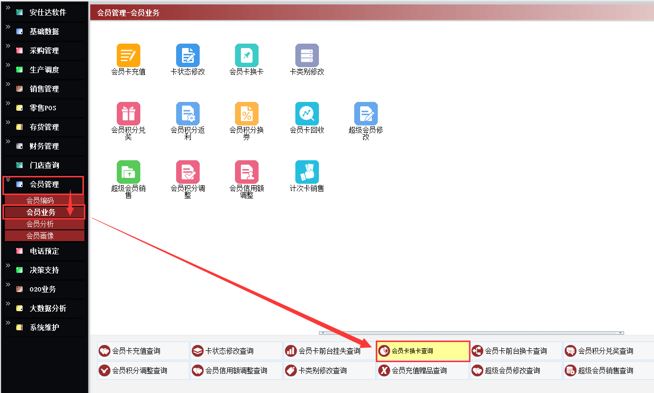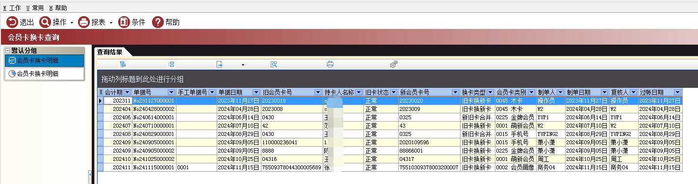 路径:【会员管理】→【会员业务】→【会员卡换卡查询】
