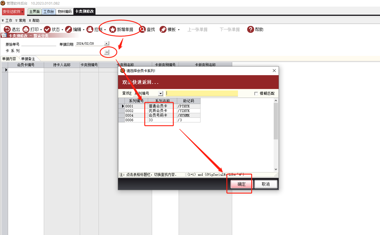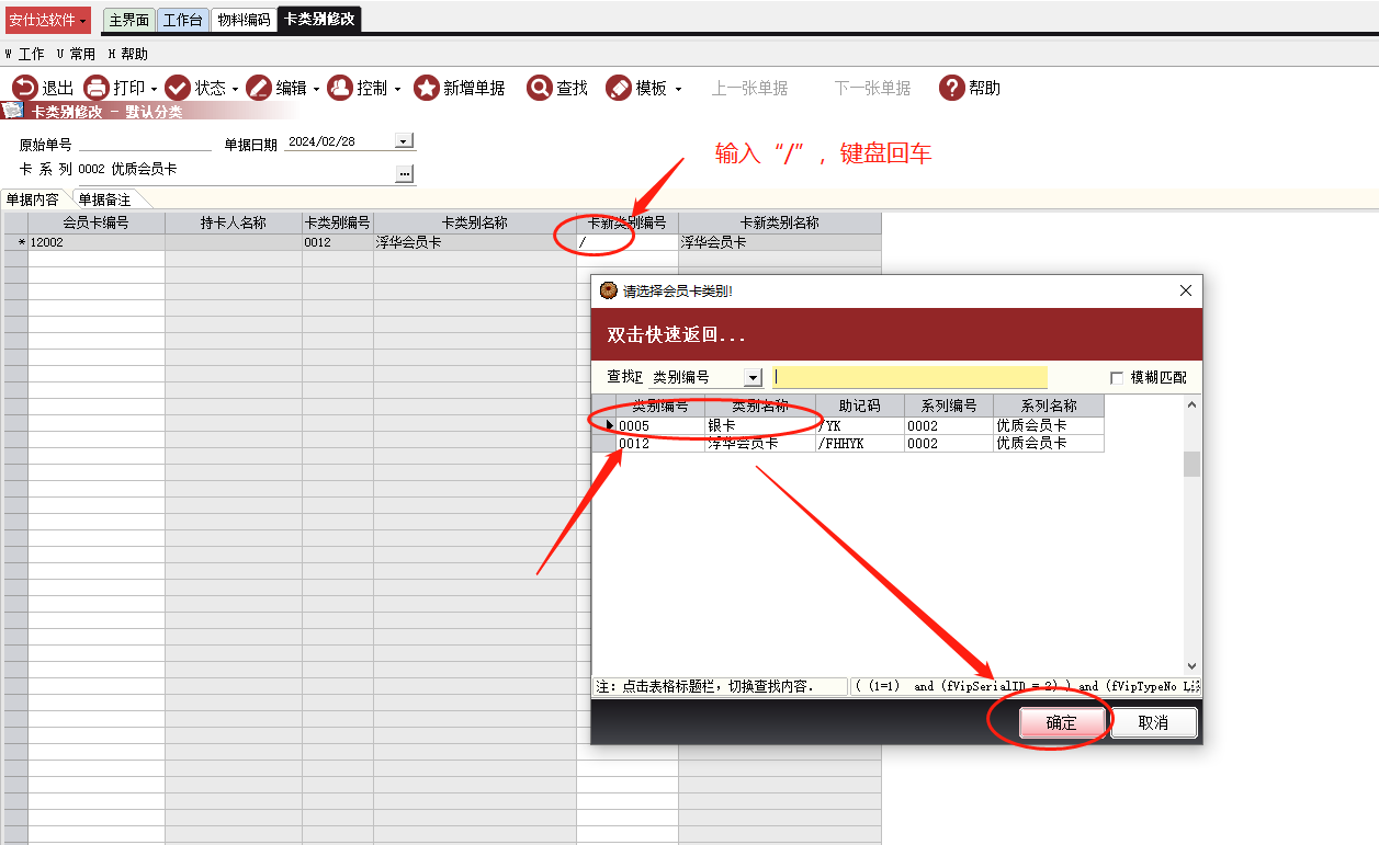 在“卡新类别编号”栏,输入“/”回车,选择会员卡新类别