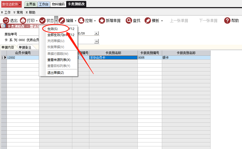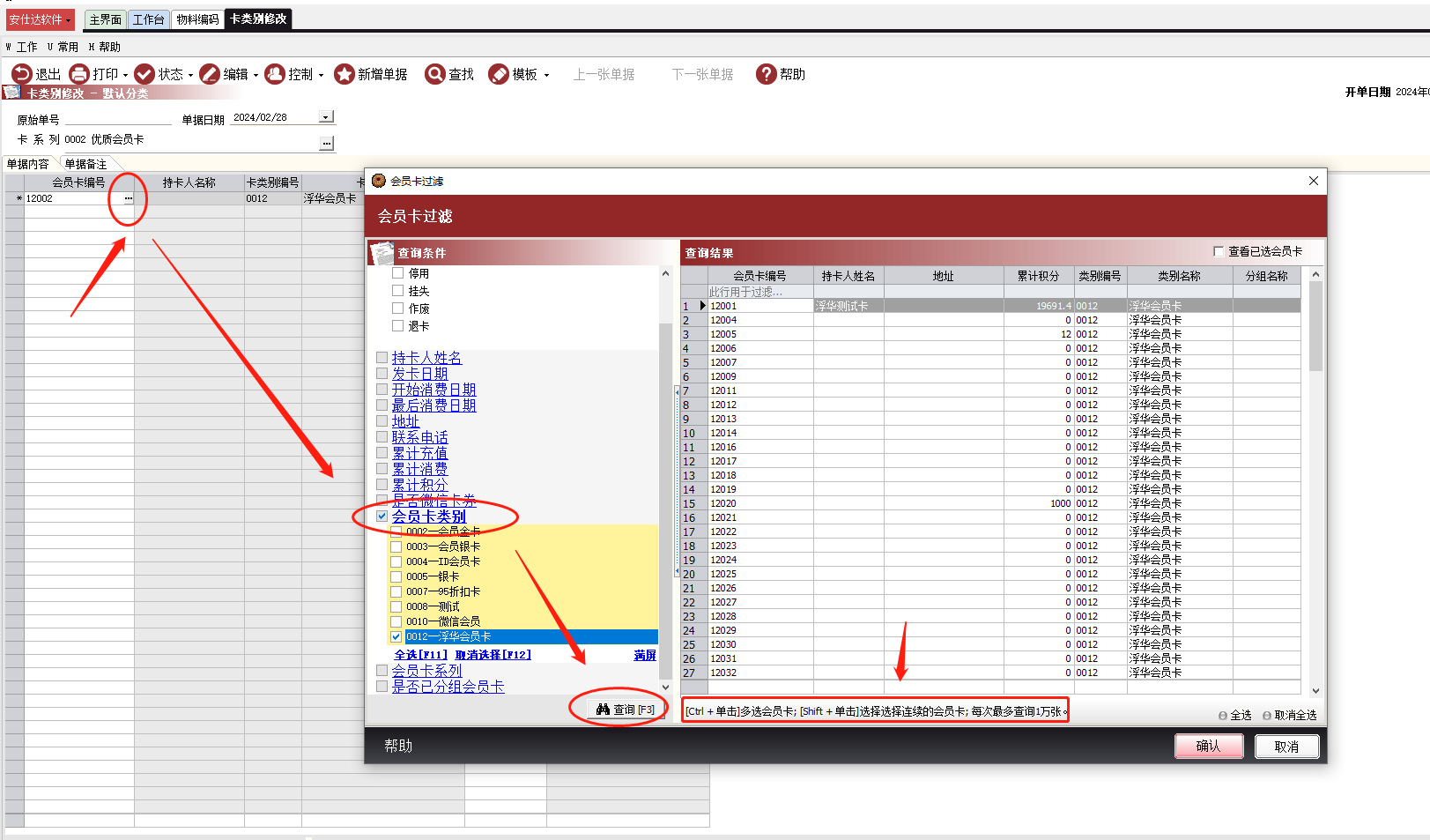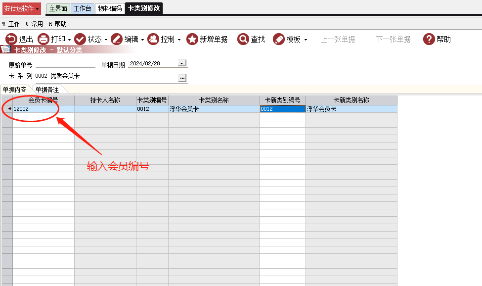 新增单据,选择卡系列,输入需要转移类别的会员卡号,或批量选择