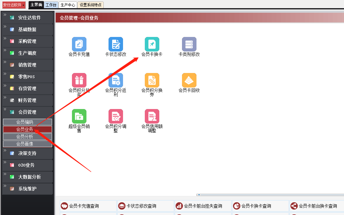 按路径打开会员卡换卡界面:会员管理 — 会员业务 — 会员卡换卡