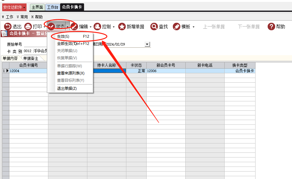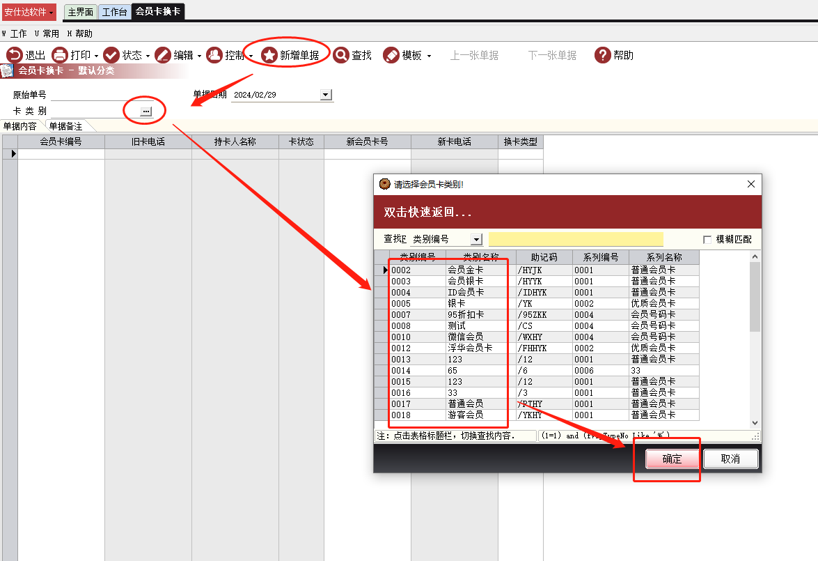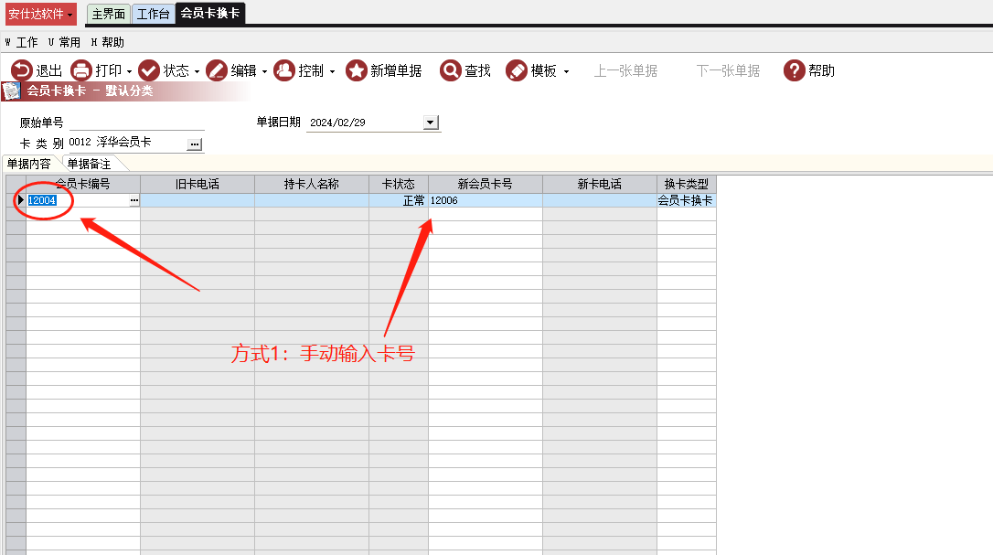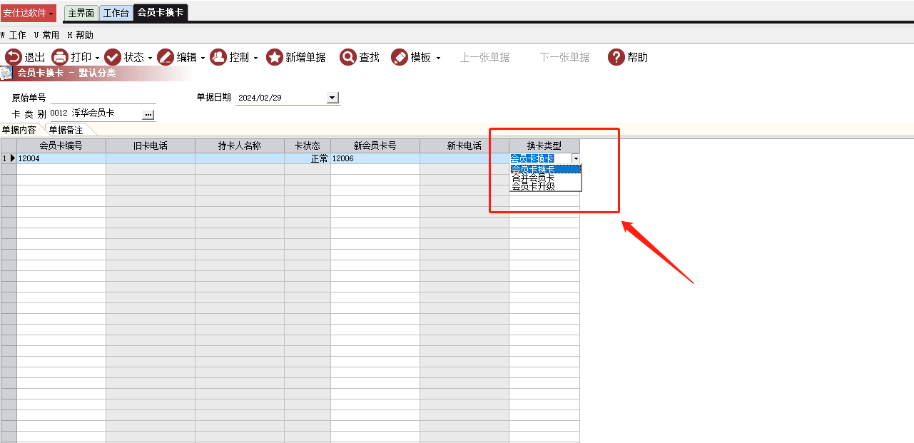 新增单据,选择卡类别,输入旧卡号和新卡号,选择换卡类型