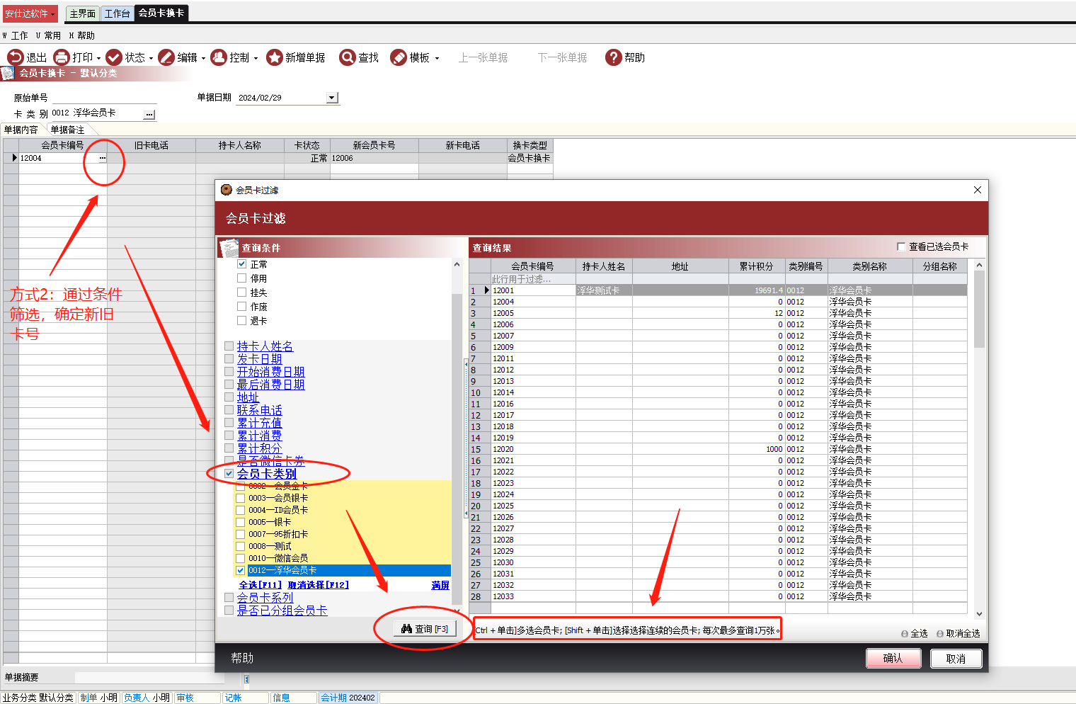- 会员卡换卡:是指将旧卡里的信息转移到一张新卡里。属于覆盖关系,旧卡覆盖新卡
