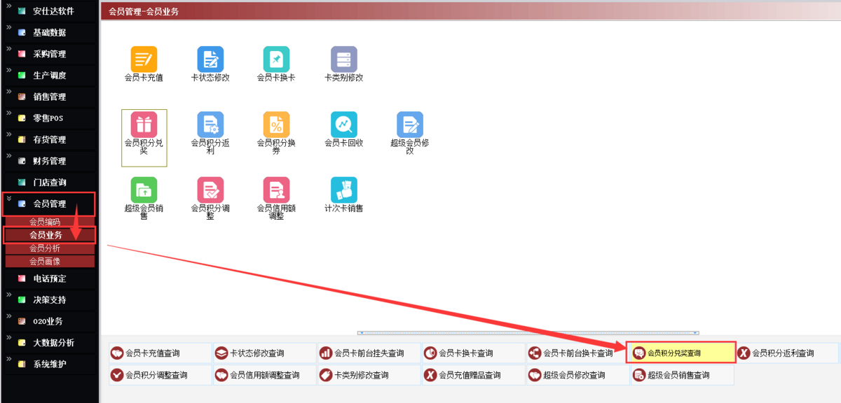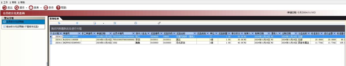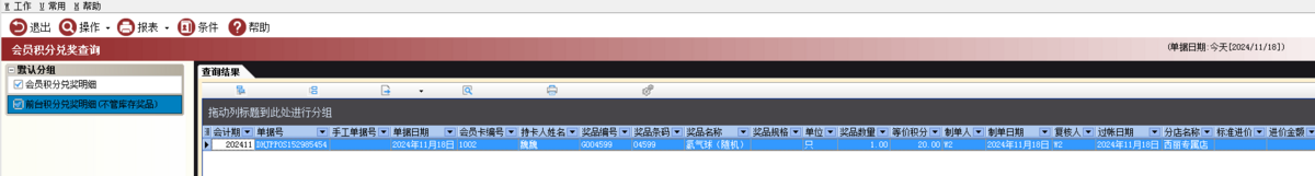 路径:【会员管理】→【会员业务】→【会员积分兑奖查询】