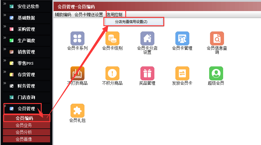 【会员管理】→【会员编码】→【信用控制】→【分店充值信用设置】