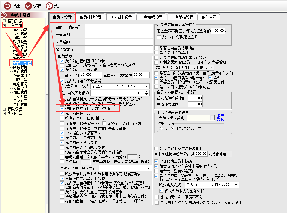 3.1勾选【使用分店充值授权(前台充值)】特点