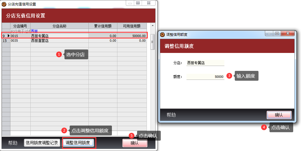 3.2设置好可以信用额度,那么门店充值金额只能在这个值的范围以内。例:加盟店设置五万的额度,那么这家门店累计会员充值金额不能超过五万元。