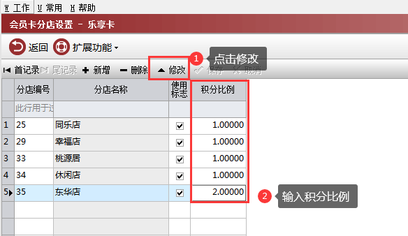 举例:东华店,设置积分比例2;则该店使用会员卡,1元积2分