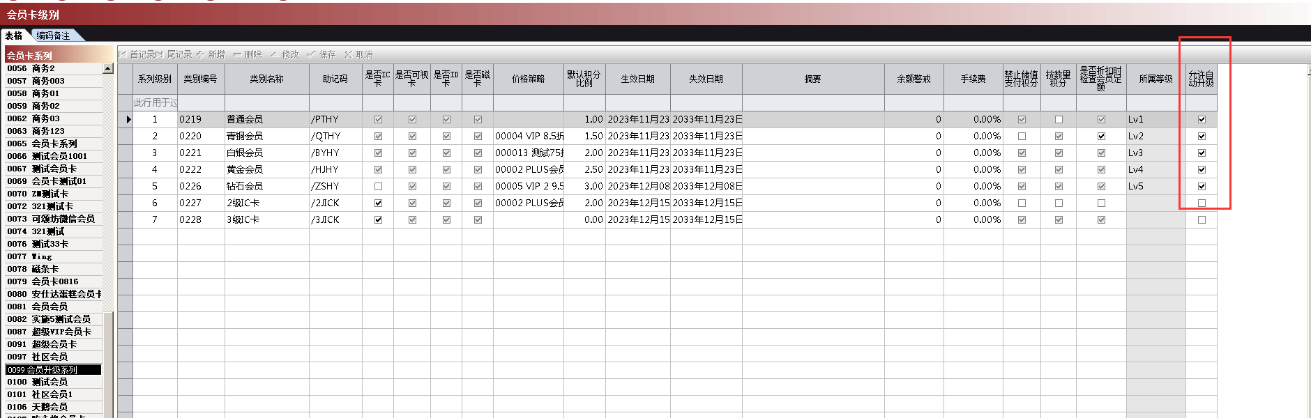 选中可自动升级会员卡系列,将系列下可自动升级会员卡类别勾选【允许自动升级】
