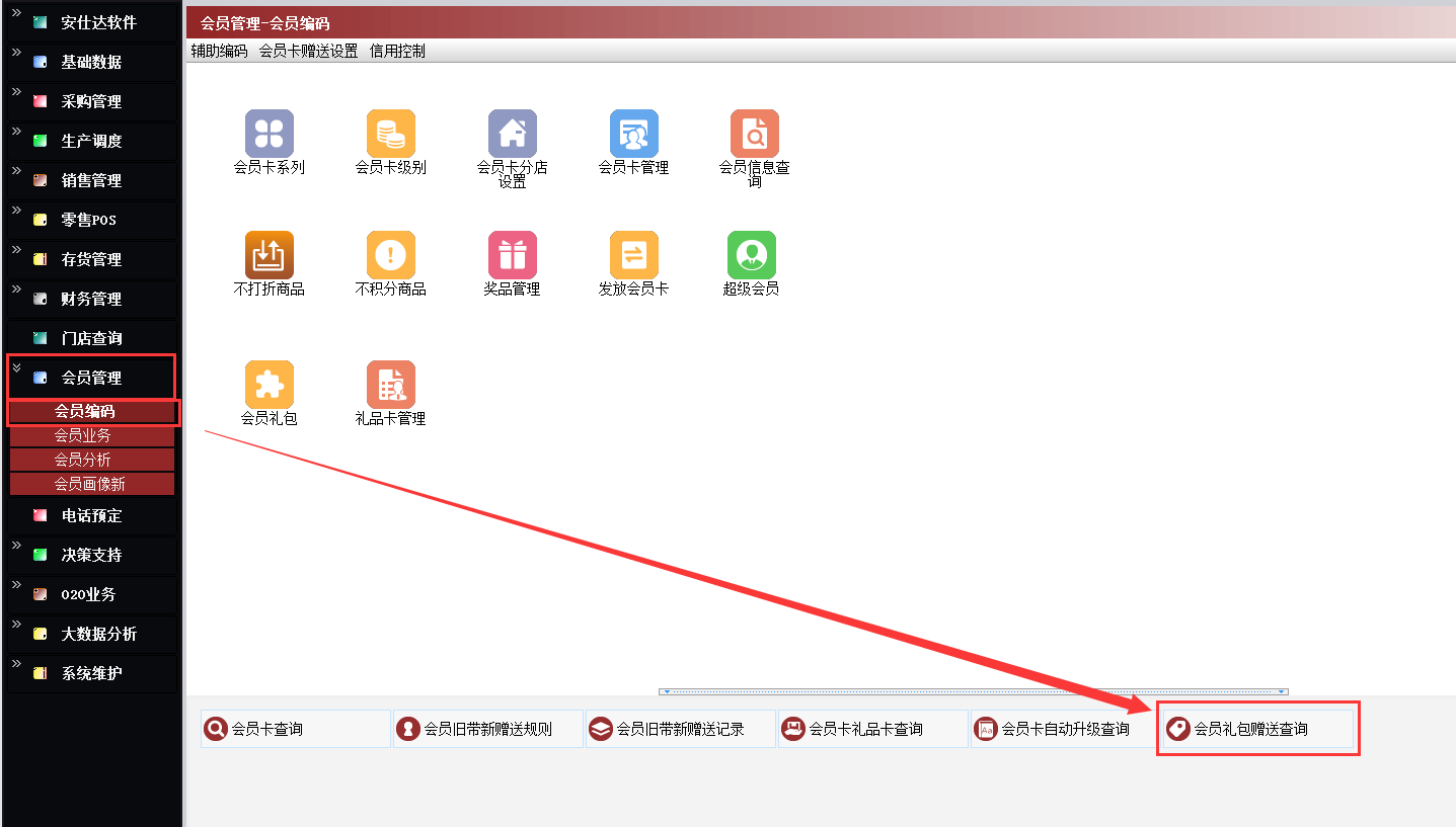 路径:【会员管理】→【会员编码】→【会员礼包赠送查询】