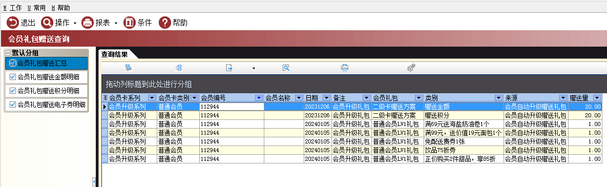 3.1会员礼包赠送汇总:可按会员卡查询,汇总礼包赠送的类别。举例:升级后,XX会员卡的赠送礼包有金额、积分、电子券。