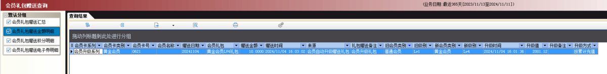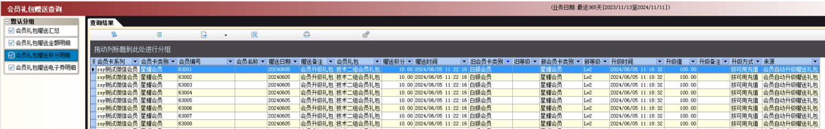 3.2会员礼包赠送金额明细:会员升级后,查询赠送金额的会员。