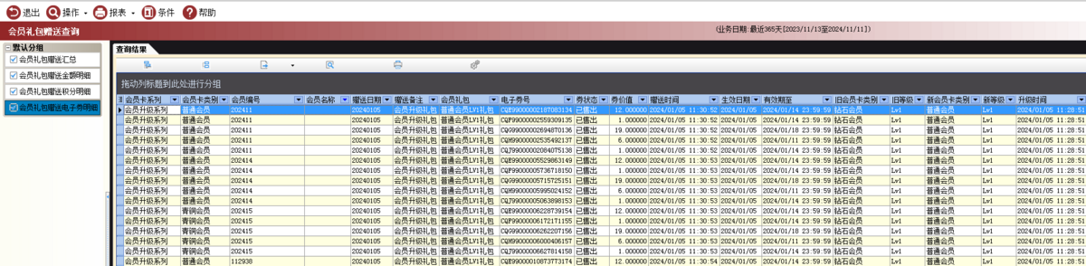 3.4会员礼包赠送电子券明细:会员升级后,查询赠送电子券的会员。