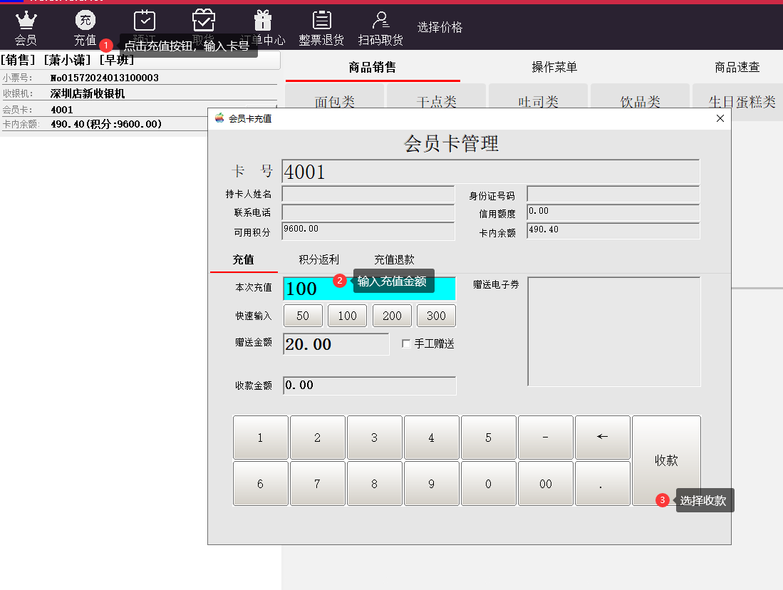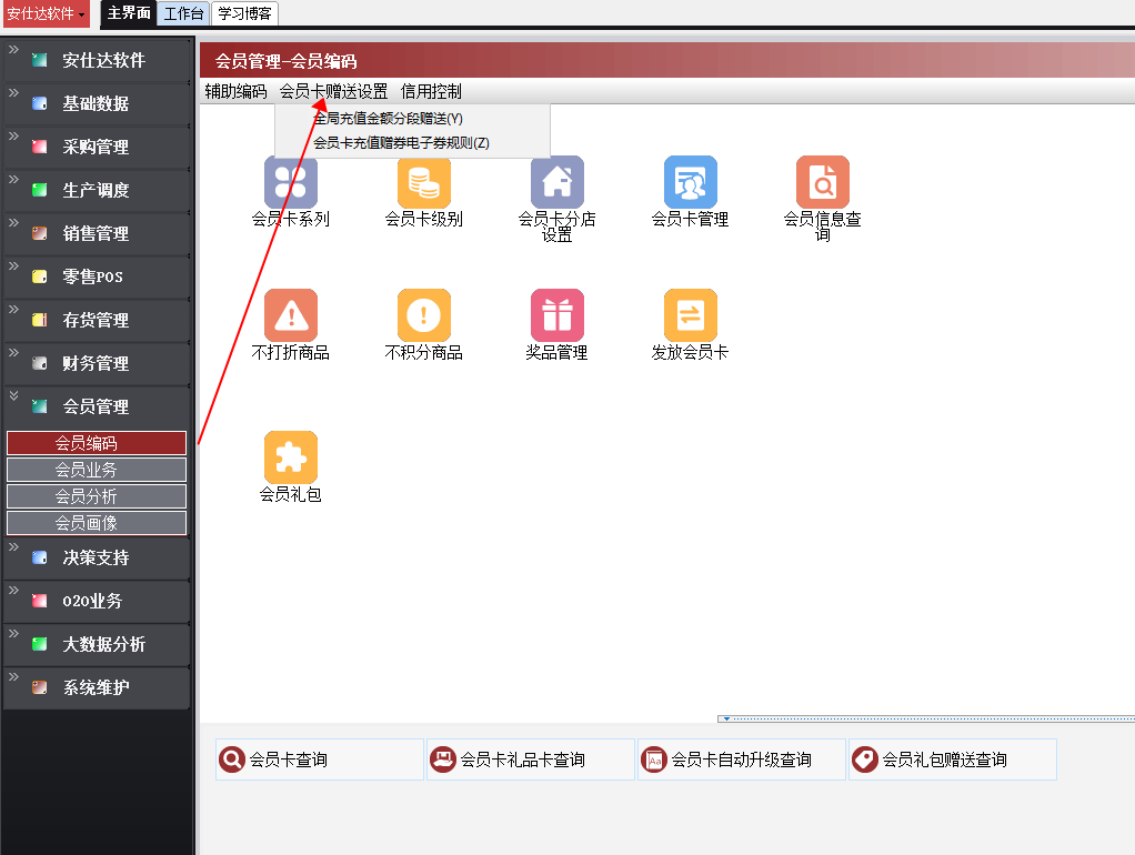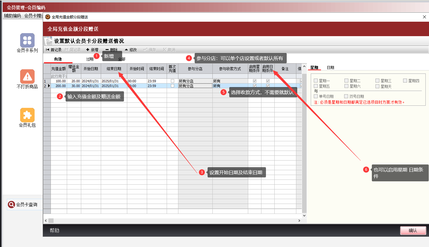 路径:【进入系统】→【会员管理】→【会员编码】→【会员卡赠送设置】→【全局充值金额分段赠送】