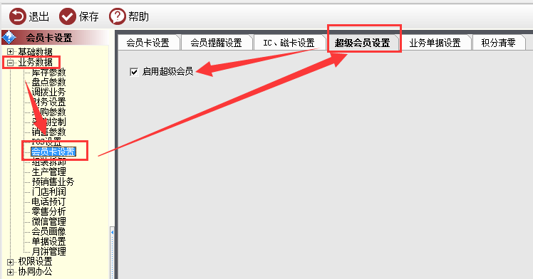 路径:【后台特点】→【业务数据】→【会员卡设置】→【启用超级会员】