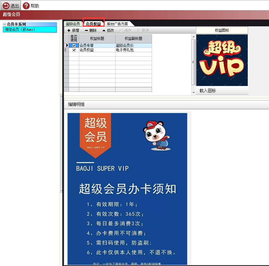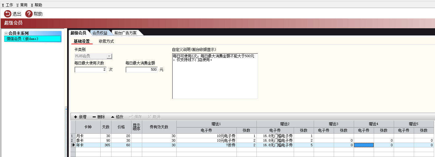 自定义说明:自定义文字说明后,输入超级会员卡可在前台收银显示。