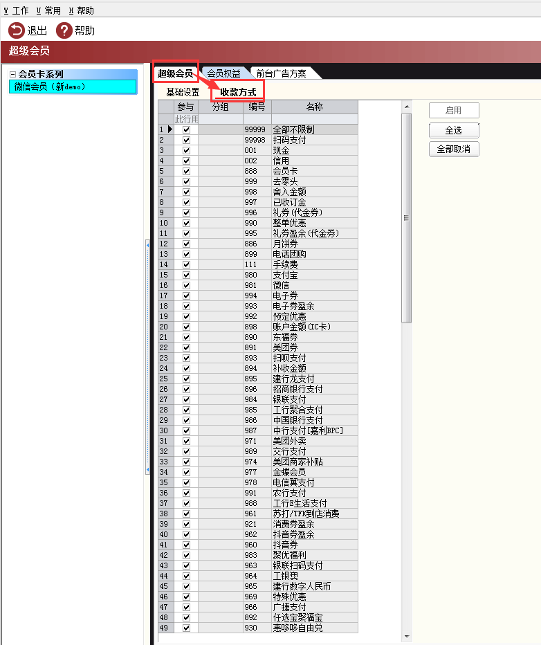 前台使用超级会员时,可以控制指定的收款方式才支持使用。例如:勾选了现金,那前台在使用超级会员时,只能现金付款。