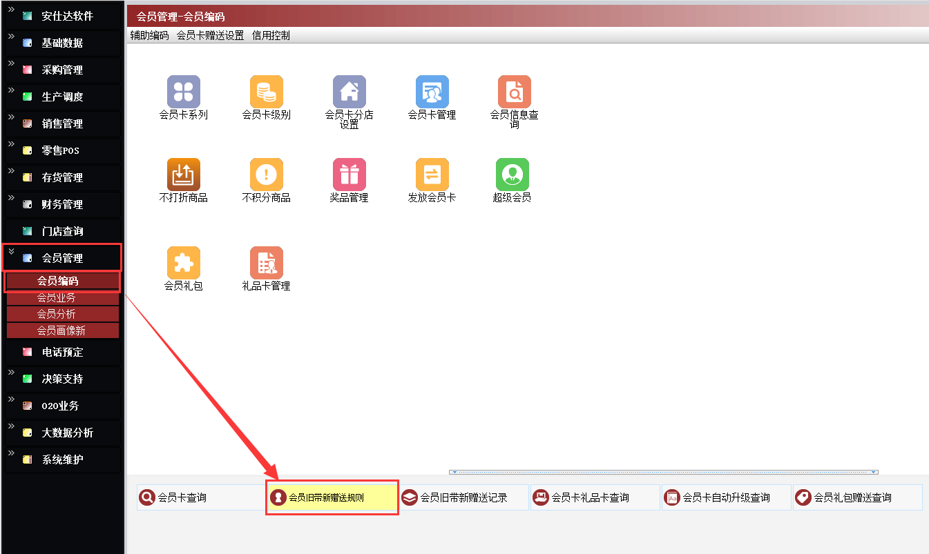 路径:【会员管理】→【会员编码】→【会员旧带新赠送规则】