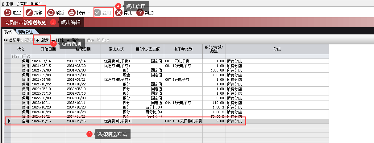3.2升级加密狗文件后,在会员卡编码的主界面会有会员旧带新赠送规则功能和会员旧带新赠送记录两个功能模块