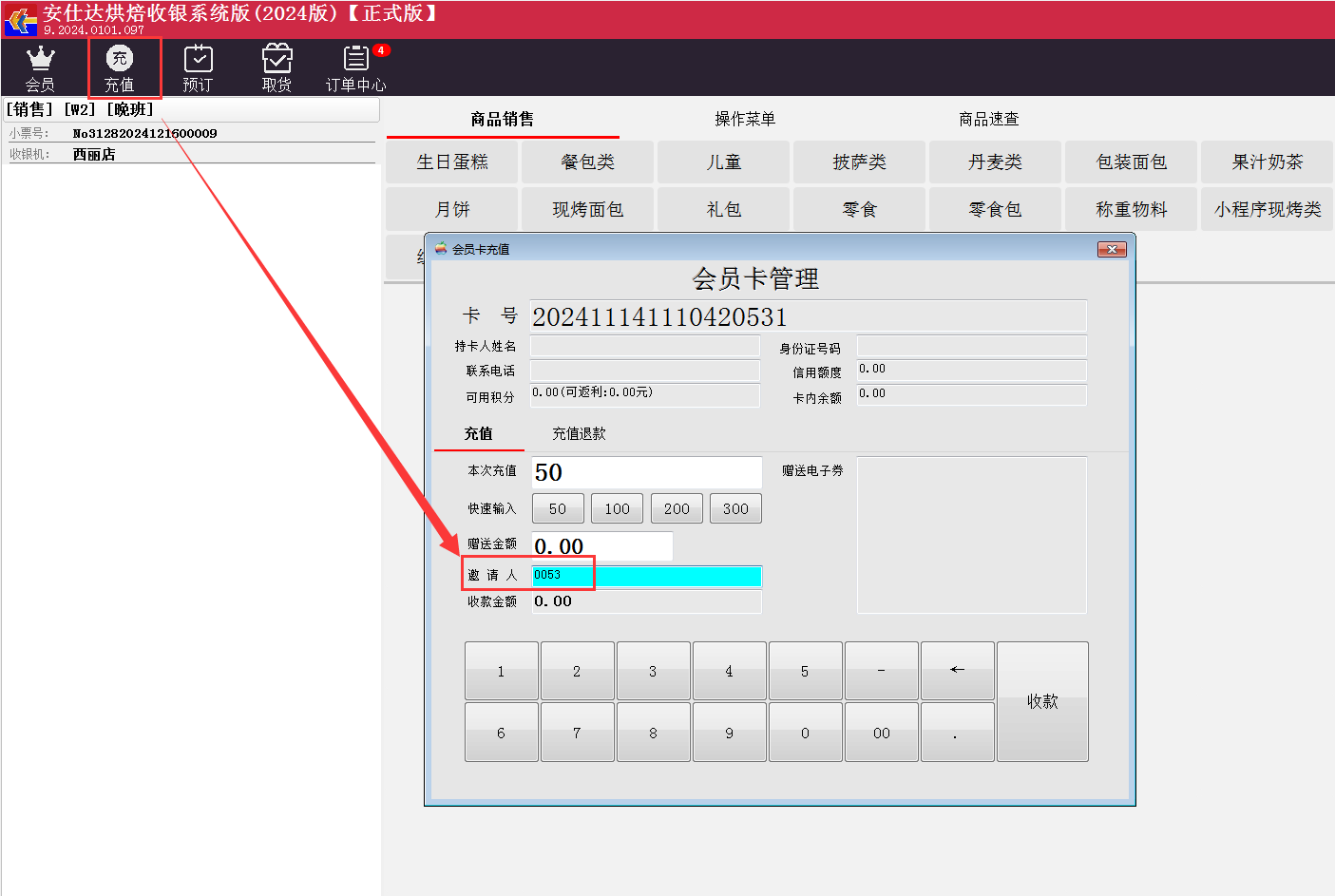 4.1前台的充值界面增加了【邀请人】的文本框,可以在【邀请人】的文本框里面输入老会员的会员卡号或电话号码