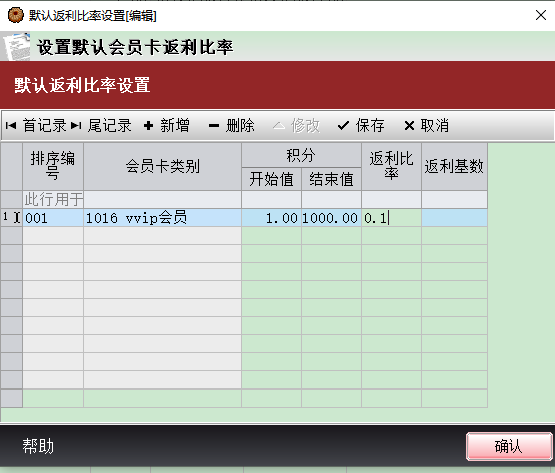 可以设置不同的积分段,返利比率不同。积分段设置:包括开始值,不包括结束值。此处定义的是默认的返利比率,如果定义了分店返利比率,优先取的是分店的返利比率