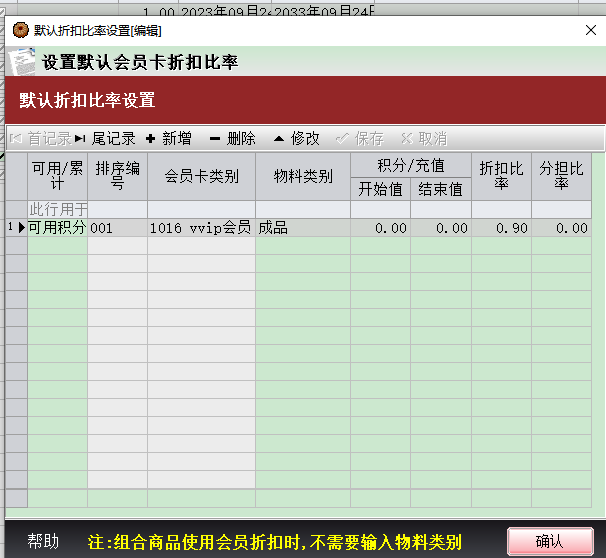 默认折扣比率设置:用于定义会员卡的折扣比例,可以根据不同的商品类别以及积分类别,定义不同的折扣值。