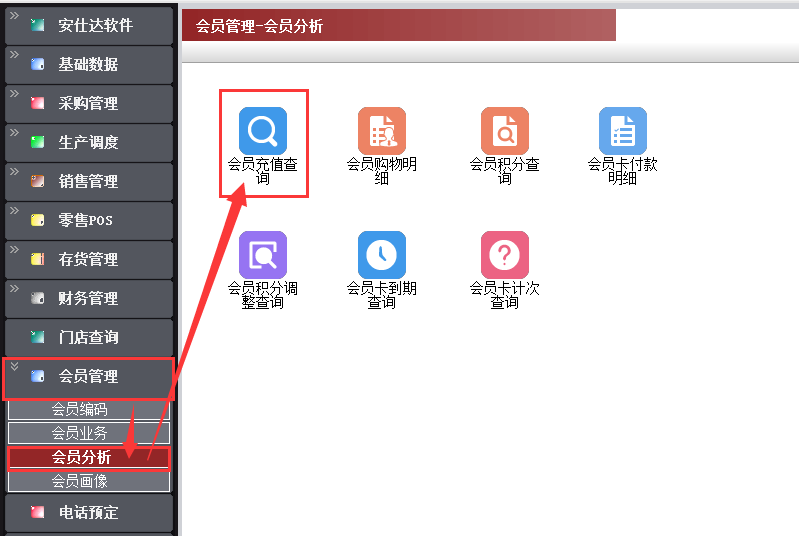 路径:【会员管理】→【会员分析】→【会员充值查询】