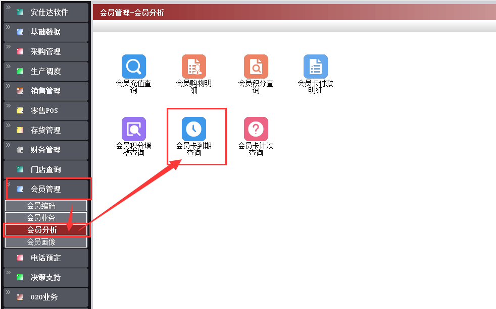 路径:【会员管理】→【会员分析】→【会员卡到期查询】