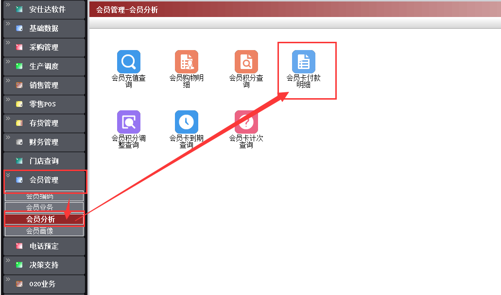 路径:【会员管理】→【会员分析】→【会员卡付款明细】