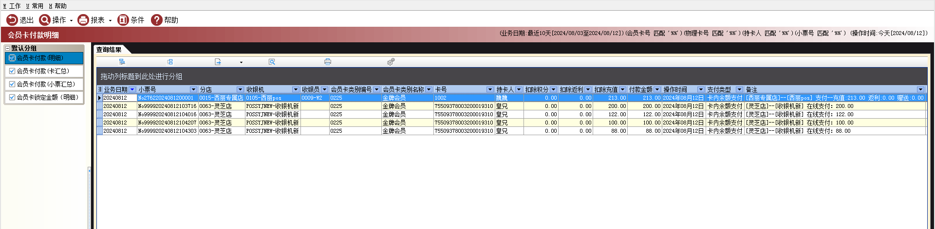 会员卡付款(明细):可以查询到会员卡实际支付的金额。