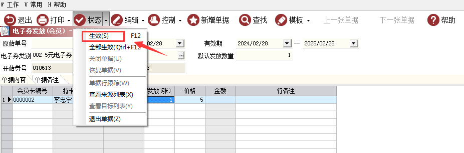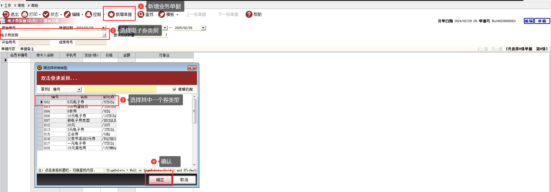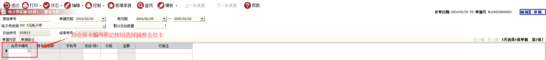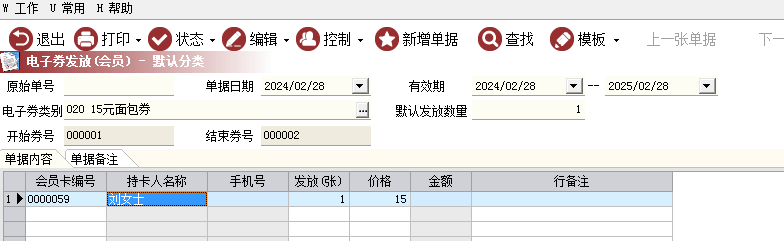 电子券新增后,可以通过后台新增单据的方式,将电子券发放到顾客的手机上,并且支持通过起止券号批量发放电子券。