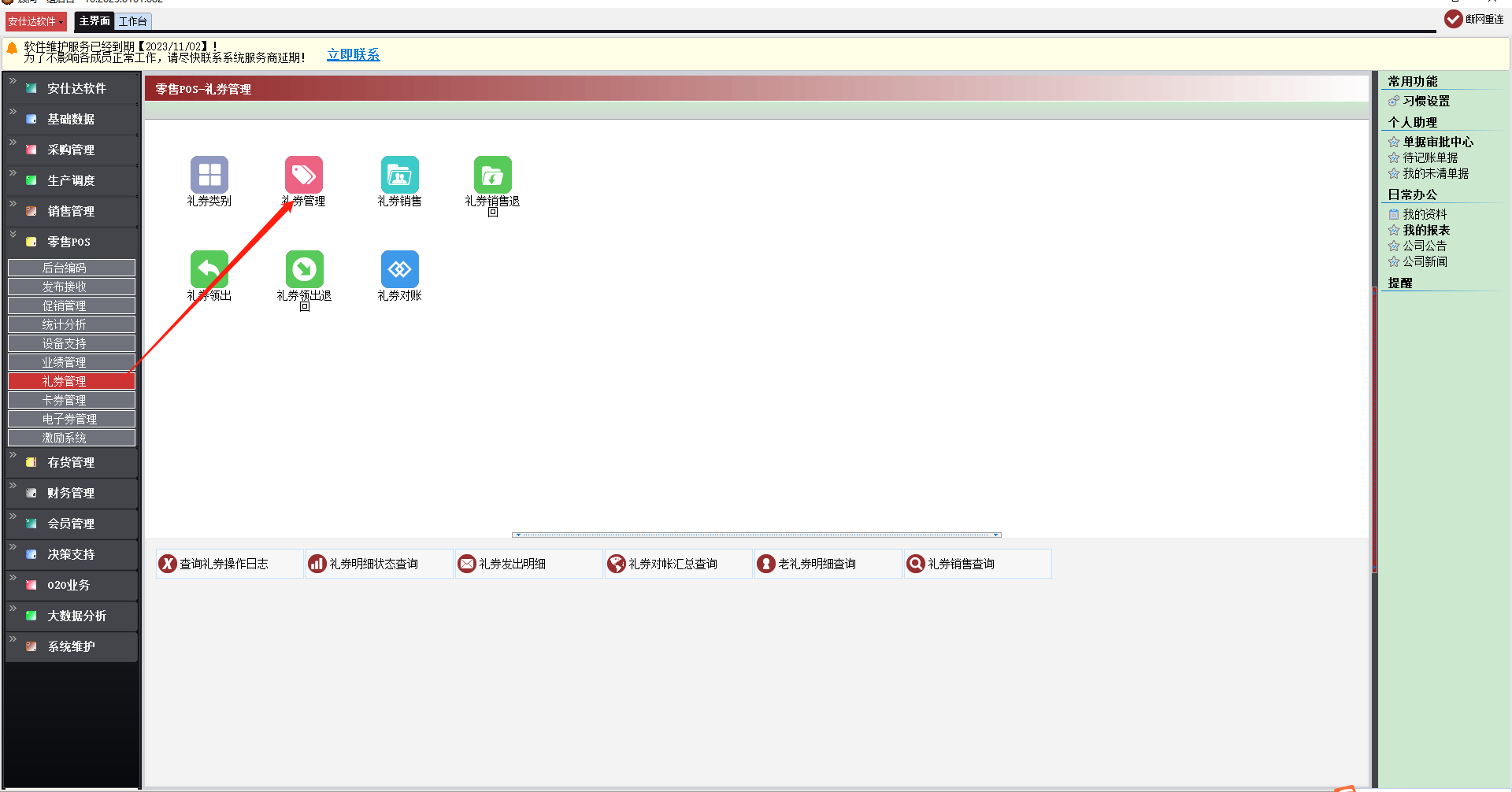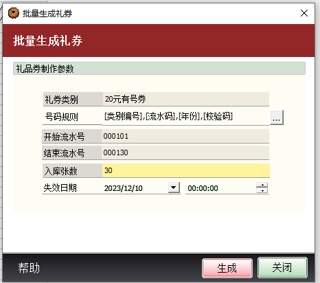 礼券管理主要用于生成有号礼券,此外可在礼券明细查询每张礼券的券号,以及使用情况,同在出入库明细中查询礼券的在库情况,即是否被领用的情况