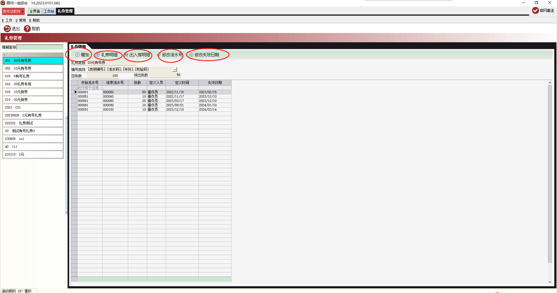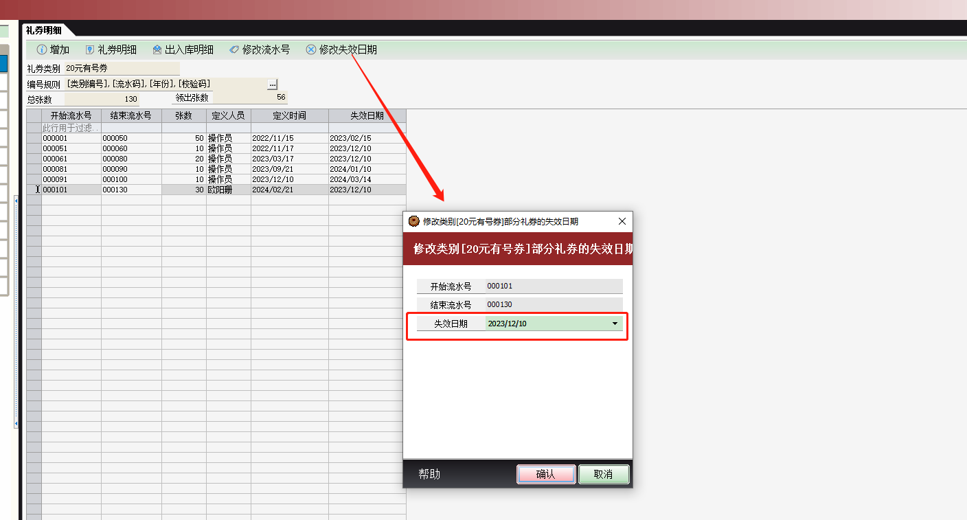 可以精确到批量修改其中增加的某一批礼券的有效期。